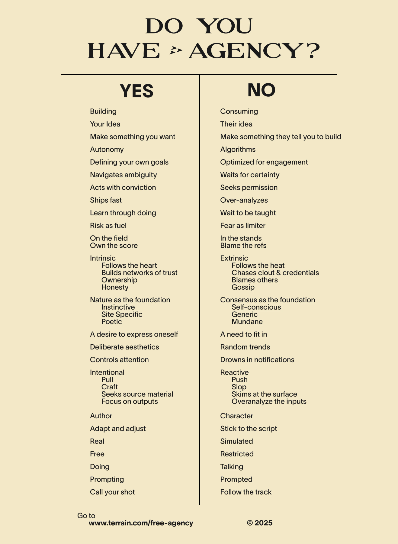 “Agency” is the kind of word that, right now, floats thickly across the web — one of those sticky buzzwords the cynical love to hate but secretly recognize as necessary. It's a bit like “taste”: precise enough to examine closely yet vague enough to become a catch-all. Why the appeal? Probably because while intelligence is becoming as mundane and effortless as a keystroke agency stubbornly clings to our human heart, reminding us we're still choosing, still acting, still (mostly) not robots.