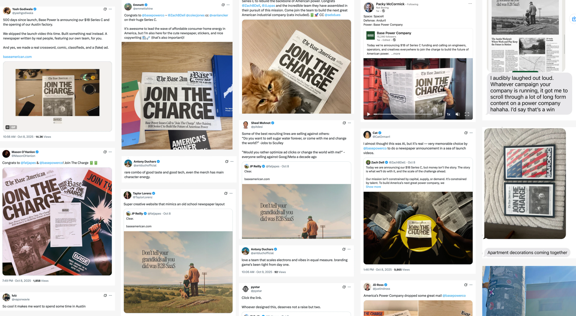 About a month ago, the Base Power creative team and I sat down for a regular check-in to discuss the Series C announcement. The goal was very clear: focus on one audience, prospective hires. Ideas flew around, another hype video (the Series B video had performed well), a founder interview, standard playbook stuff... Then inspiration struck from Maya (who interned for the company this summer and recently joined full-time as a designer): “what about producing an actual newspaper?”